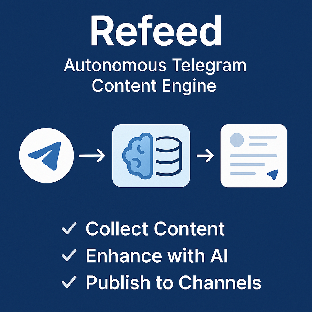 Refeed is a self-hosted, fully autonomous content engine for Telegram. It connects to your user account (not a bot), collects posts from selected channels, improves them using AI (like GPT or Claude), lets you moderate the output via a Telegram bot — and republishes the content into your own Telegram channels.